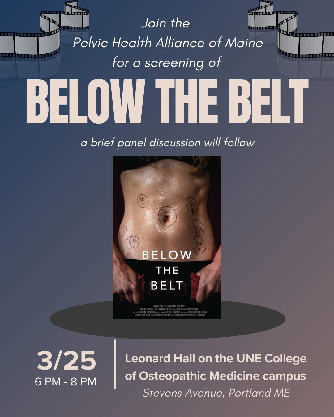 March is Endometriosis Awareness Month! The Pelvic Health Alliance of Maine (PHAM) in partnership with the UNECOM OB/GYN club is thrilled to host a screening of the groundbreaking PBS documentary Below the Belt. Through the personal & inspiring stories of four patients urgently searching for answers to mysterious symptoms, the film exposes widespread problems in our healthcare systems.